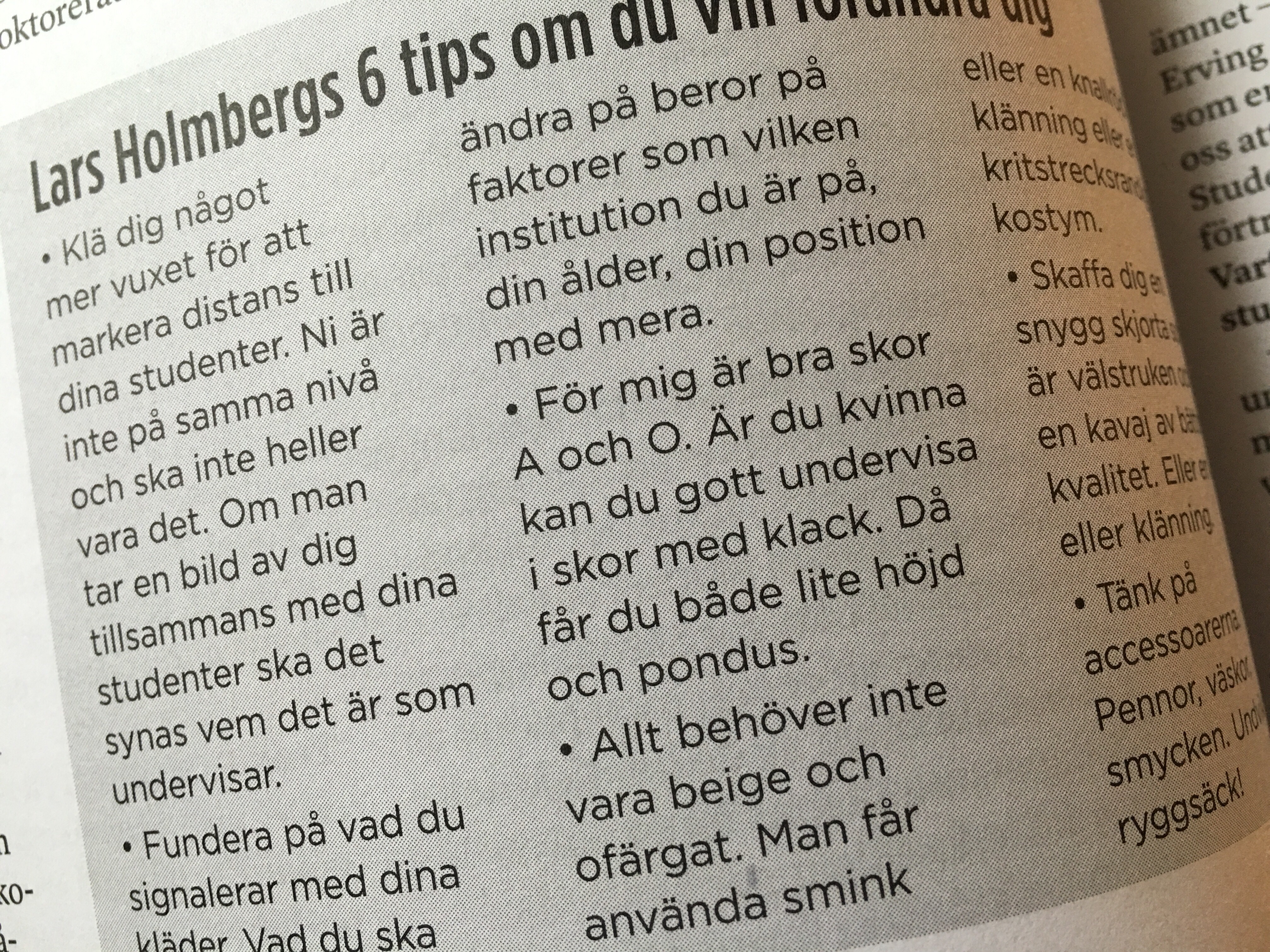 About half way through, I stumbled on an article called “Dressed for success – rätt klädd i undervisningen” and it stirred up some thoughts. Some of the advices were to dress more grown up, to signal a distance to your students – “you are not on the same level and shouldn’t be either”. I do make an effort to dress professionally when I’m teaching – but I also think that there is balance to keep here. There is of course some distance between faculty and students, but teaching at an international master programme means I will have students that are older than me and have more experiences from certain areas than I do. Although I’m the expert in my field, I want to express that there is mutual learning going on in our dynamic classroom and I don’t have monopoly on knowledge.